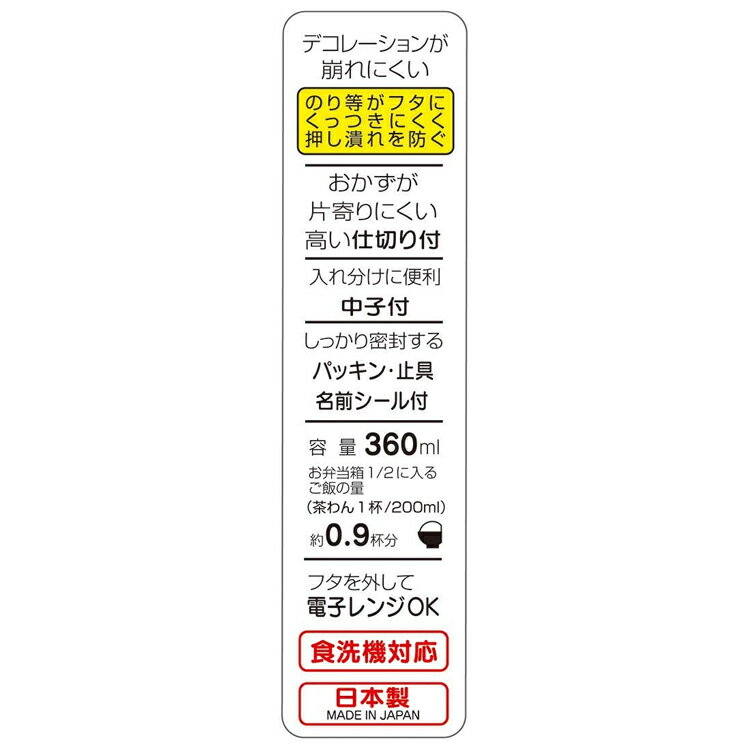 子供用の弁当箱として最適な360ml容量、中子付きのお弁当箱!中子付きなのでおかずとご飯をすっきり分けて盛れ、本体が汚れにくく洗う時のお手入れが簡単☆